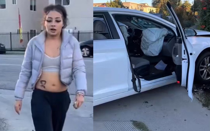 Woman involved in a hit-and-run in North Hollywood returned to the scene just to retrieve her phone from her wrecked car and then left again. And she's on video doing it. Dummy.