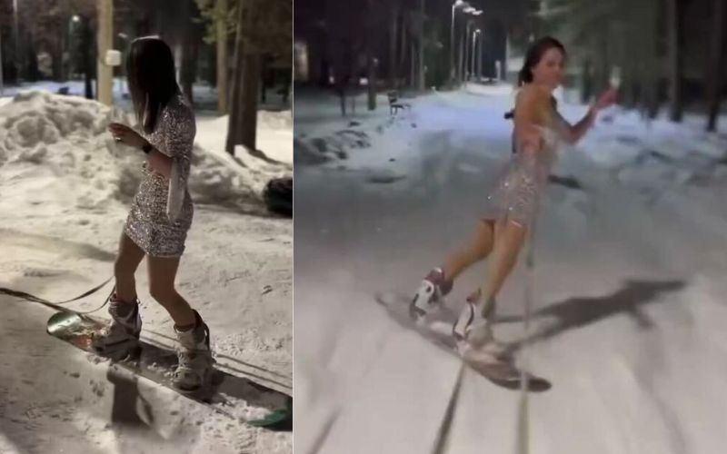 snowboarding in a glittery miniskirt
