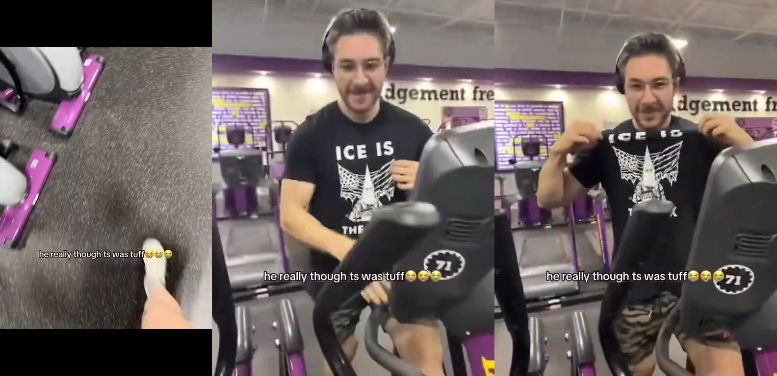 She asks this guy at the gym to show his anti-ICE shirt, and then replies, “I just want to show everyone what a f*king p*ssy you are”